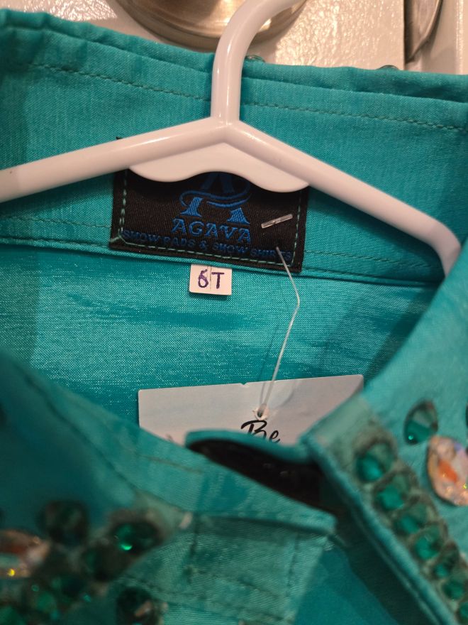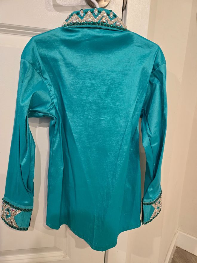 Teal Youth Size 6T Western Show Jacket with zipper front and velcro wrist closures for easy adjustment. Silver embellishments on the cuff, collar and down the front.